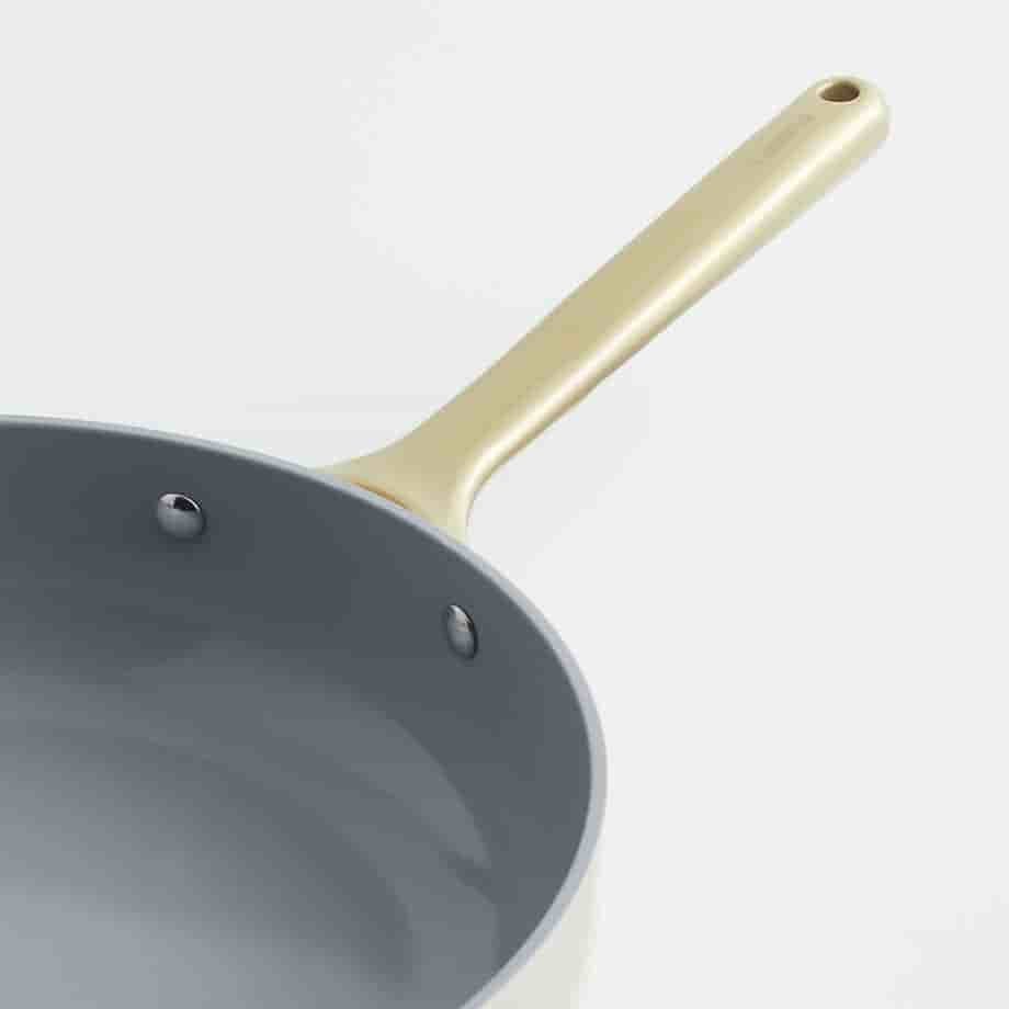 Featuring a minimalist design with a creamy exterior and gold handle, the skillet is made just for us. The ceramic coating provides superior non-stick performance for excellent results.